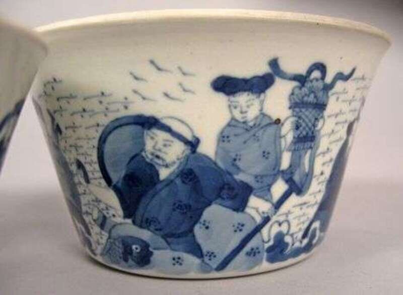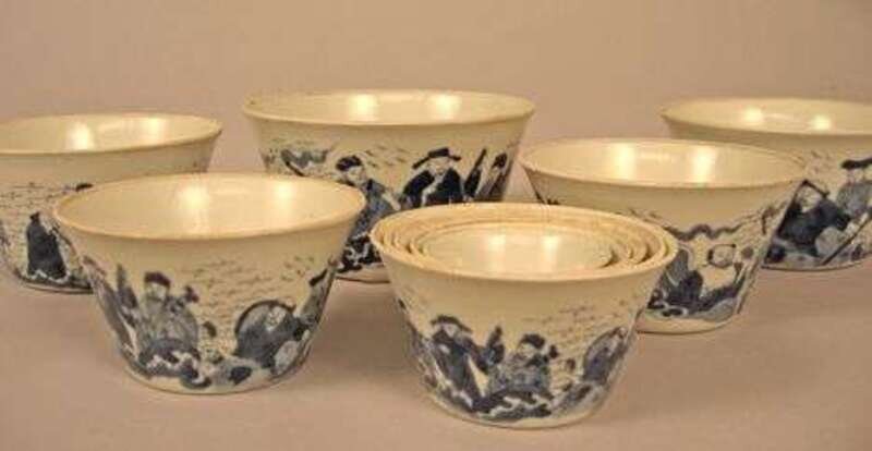 Of deep U-shape form, the outer wall painted to show a figural landscape and ruyi cloud to the inner wall of the smallest bowl.