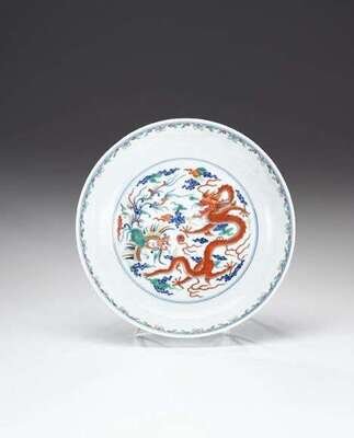 Of gently rounded form, thinly potted rim underglazed blue rings painted with doucai enamels to show alternating foliate scrolls, the central medallion painted to show a red five claw dragon and phoenix bisected by a red enamel and blue underglazed flaming pearl, surrounded by lingzhi scrolling clouds, the outer wall enameled to show six Fu bats over a blue underglazed scrolling sea framed by two blue bands, raised on a short circular foot.