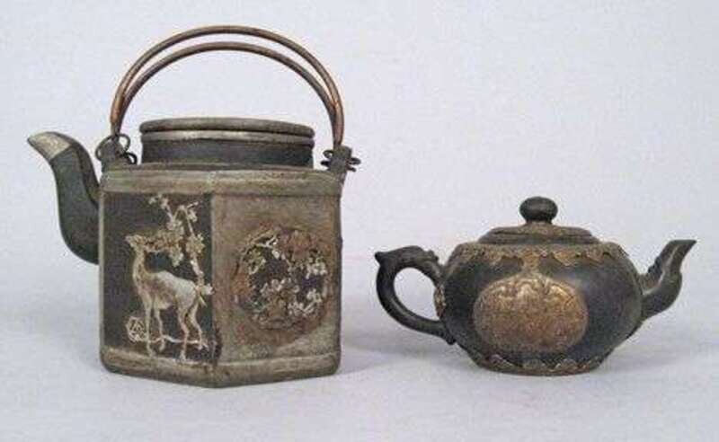 Two Chinese yixing zisha ware and white-white metal mounted teapots late qing dynasty