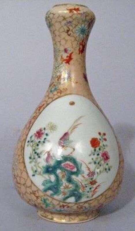 Of garlic head form, waisted slender neck leading to a pear form body, well enameled to show bird scenes in reverse on a peach ground highlighted with floral sprigs.