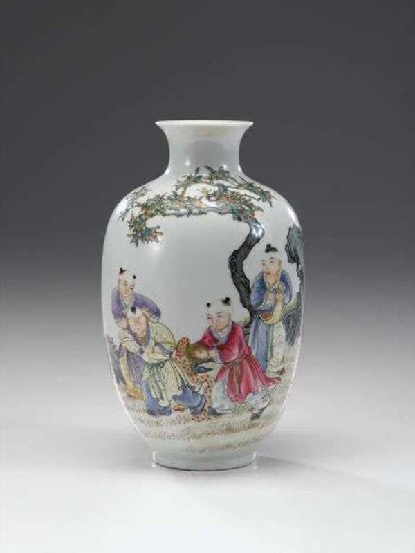 The flared mouth issues from a slender neck, the ovoid tapering body is well enameled to show boys at play under a fruiting tree.