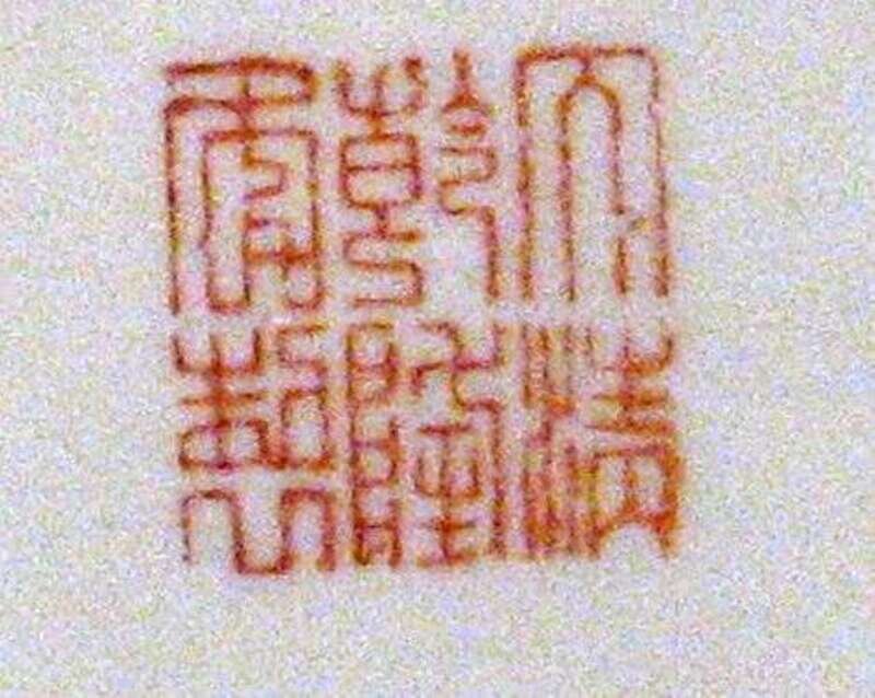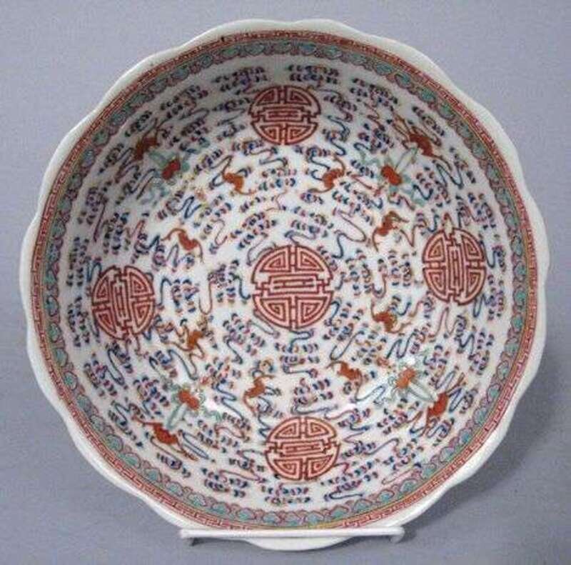 Of foliate rim and deep-U shape form, well enameled ruyi diaper to rim and Shou-bats, symbols and clouds.
