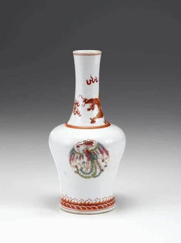 Slender neck issues from an ovoid body, decorated with a iron red dragon and phoenix roundrels to body, all above iron red scrolling sea.