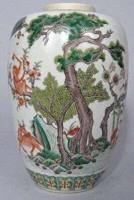 Of ovoid form, blue underglaze band to shoulder, famille rose and iron-red decorated body, showing deer and monkey amongst foliate trees.