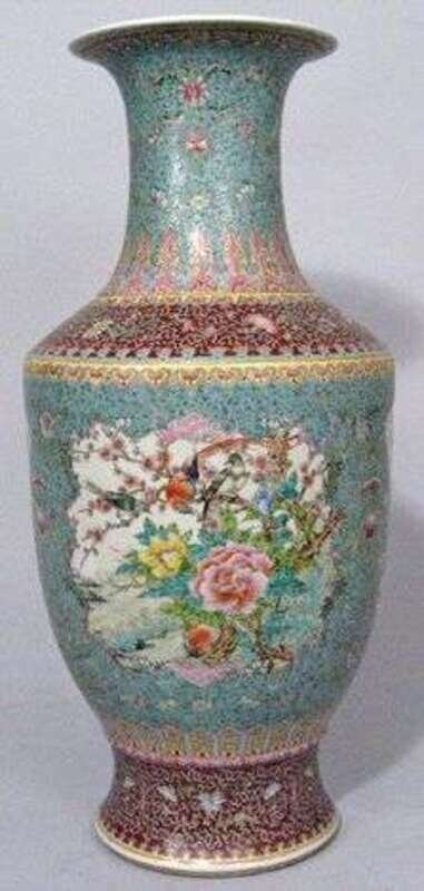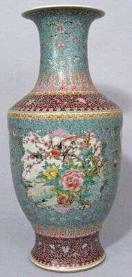 Of baluster form, flared mouth slender neck over an urn shape body, well enameled to show Indian lotus scrolls over light blue and coral red ground, two large landscape cartouches to body, flared circular foot.