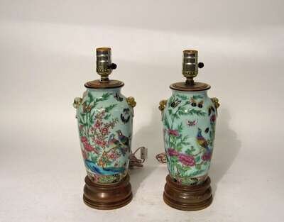 Each decorated with foliage, birds and butterflies on a celadon ground, now mounted as lamps. (2).