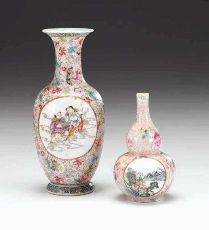 Of baluster form the flared mouth enameled turquoise to the interior, over a slender neck issuing from an elongated baluster body raised on a small circular foot, well decorated with two oval medallions depicting immortals on a mille fleurs ground enclosed in a Greek-Key band.