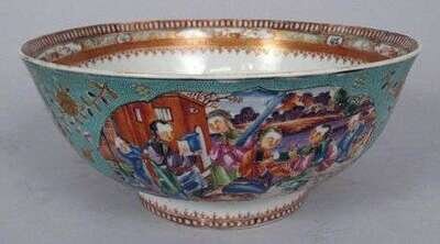 Of deep U-shape form the inner wall rim painted with a band of iron red and black oval medallions and gilt Greek key, with a central medallion of Canton merchants, the outer wall painted with four quatrefoil medallions of figural scenes enclosed by a beaded blue glazed and gilt highlighted ground.