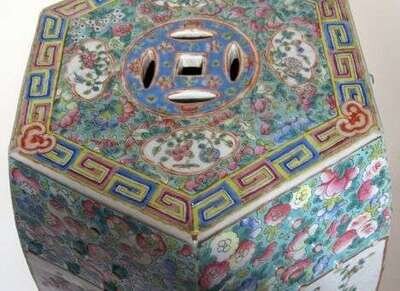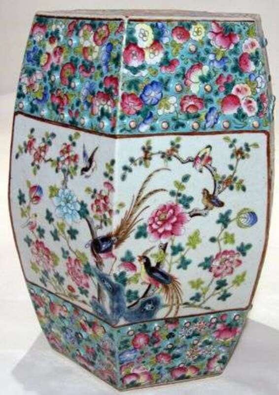 Of cylindrical hexagonal form, pieced medallion to seat and base decorated in rich enameles to show reverse panels of birds to a green mille fleurs ground.