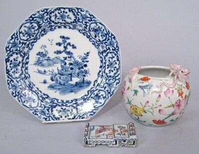 Of cylindrical form, the narrow mouth applied with qilong and fu bat, the body painted with floral sprigs, together with a iron-red, blue and pink enameled brush rest, and blue and white 18th century plate.