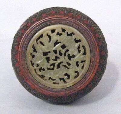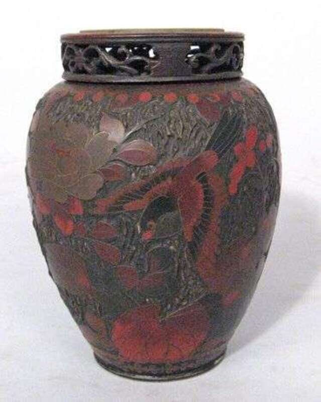 The domed hardwood and jade insert cover, surmounts a red and black lacquered porcelain vase, worked to show song-birds and floral sprigs.