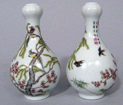 Of garlic head form, slightly ribbed mouth, slender tapering neck over a compressed body raised on a short foot, well enameled to show floral sprigs and song birds, poetic verse and seal verso.