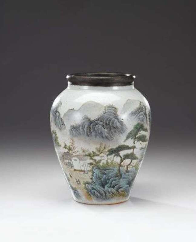 Of wide tapering form, pewter capped rim and unglazed foot, the body well painted to show a landscape scene with poetic script and seal marks.