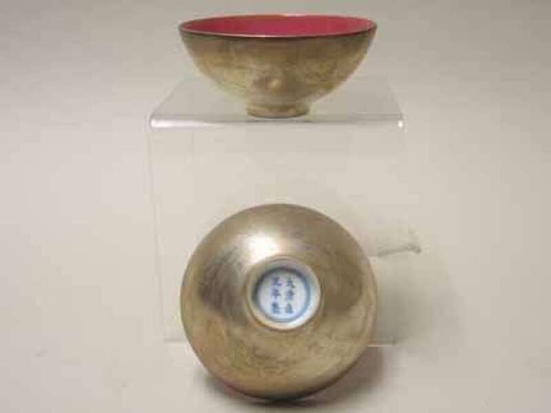 The very finely potted bowls are silvered showing village landscape, glazed to the interior with a rose color monochrome.
