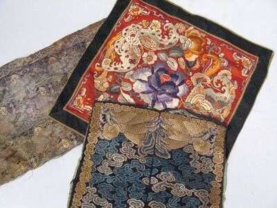 Comprising of a rank badge fragment, purple silk apron-skirt, and wall hanging, together with various other fragments.
