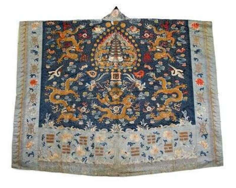 Of overall rectangular form, the central opening is framed by two light blue embroidered bands, the back panel finely embroidered to show a pagoda to the center surrounded by seven golden thread five claw dragons, ruyi clouds, zodiac medallions, Fu bats and Shou characters.