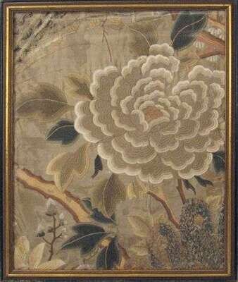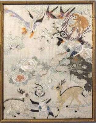 Both of square form, one of tight closely woven thread to show a foliate profusion, together with a silk on ivory color ground animal landscape, both framed and glazed.