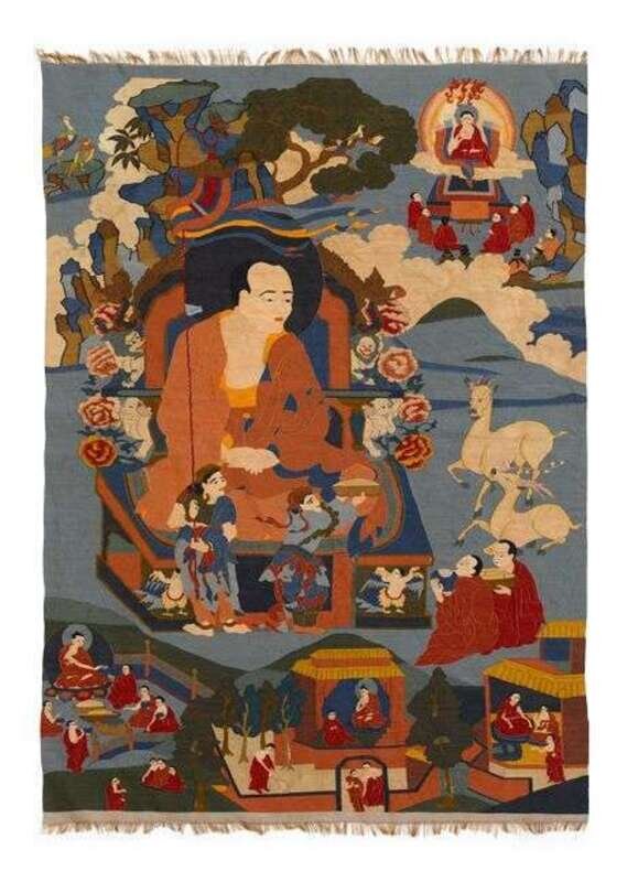 Well detailed kesi panel, vibrantly depicting Lohan and attendants, peony, animals of the zodiac all set among a cloudy mountainous landscape.