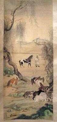 Both of color wash and ink on silk, depicting horses and figures to a mountainscape, both with seal marks.