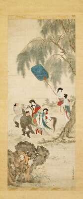 Scroll, color wash and ink on paper, depicting a figural procession, amongst a landscape, script and seal mark, ivory mounts.