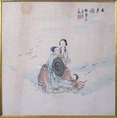 Color wash and ink on paper depicting Immortal on buffalo supporting a beauty, glazed and framed.