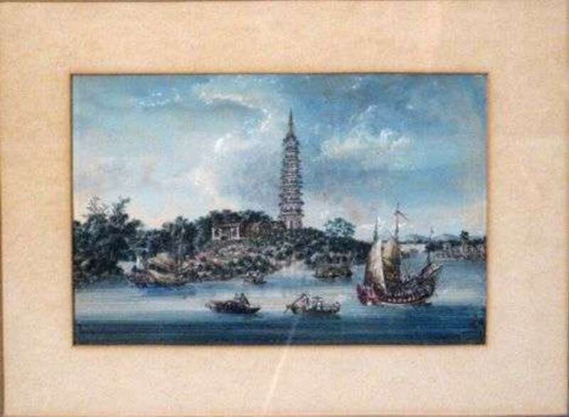 Color wash on paper, depicting a China sea riverscape with a tall pagoda in the background and junks to the foreground, framed and glazed.