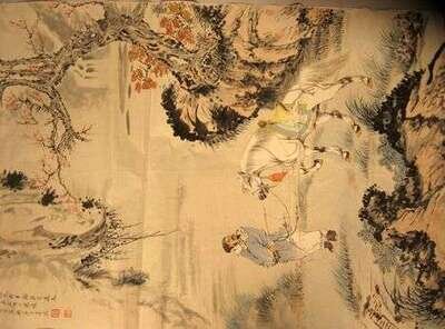 Color and ink on paper, depicting a horseman, row of script and red seal marks.