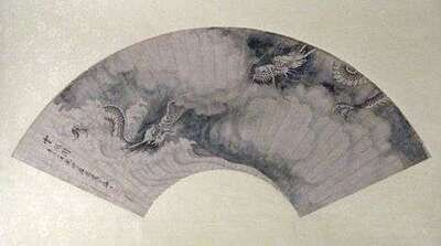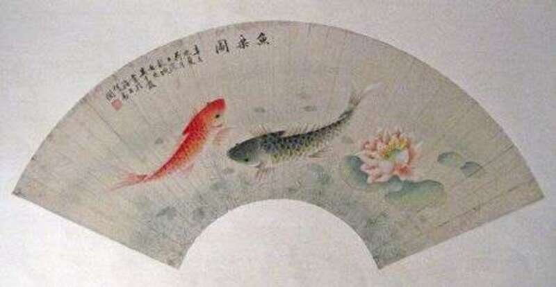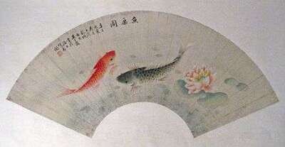 One of ink on paper later laid down, depicting two dragons, together with a well printed color and ink fan depicting carp among lotus flowers, script and seal marks to both.