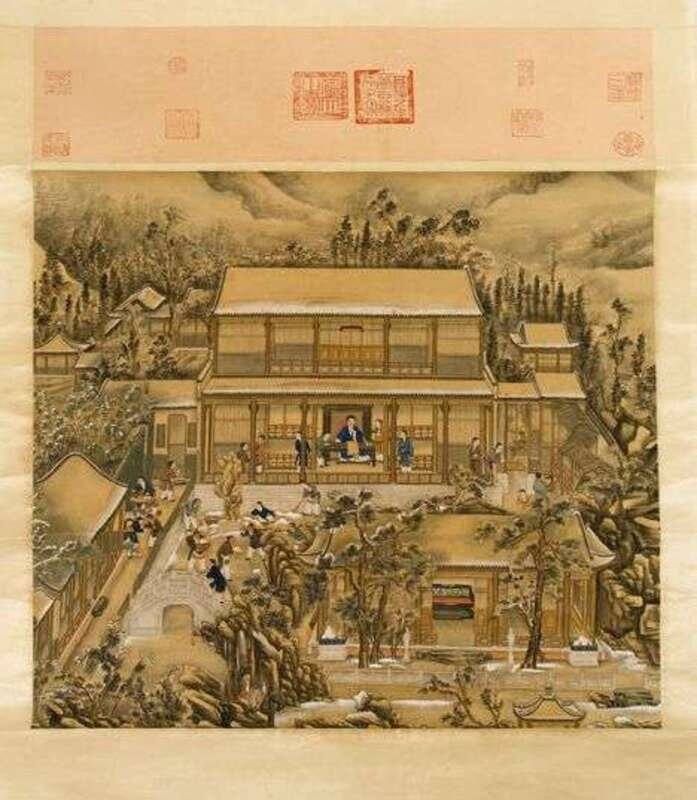 Hanging scroll, various spurious seal marks, well painted Imperial pavilion scene.