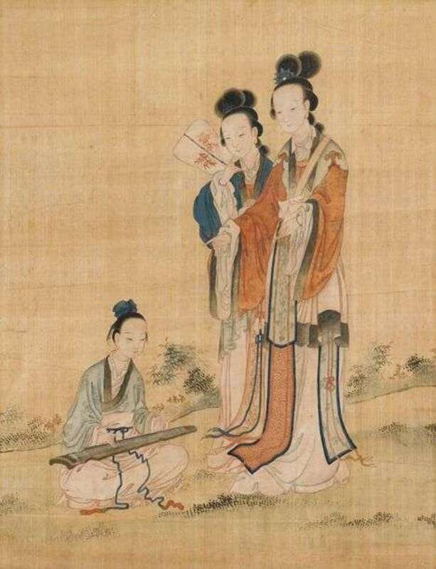 Of square form, wash and ink on champagne silk depicting three well painted court beauties, glazed and framed.