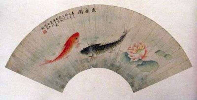 Laid down on cardboard, ink and color wash on paper depicting narrow bodied fish and fine reeds, and one depicting carp in a lotus bed.
