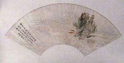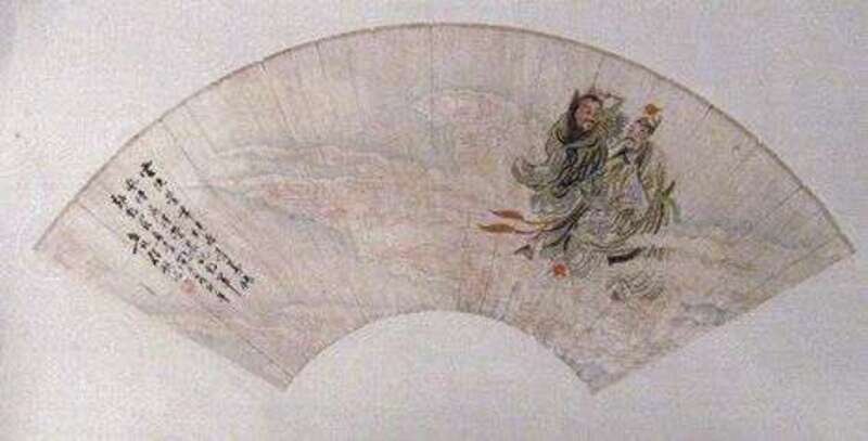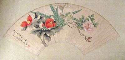 Both laid down on cardboard, ink and color on paper depicting peony and script and seal mark, together with on depicting two immortals.