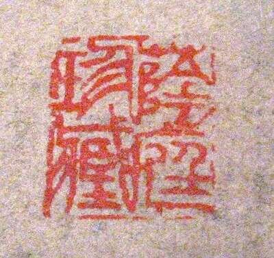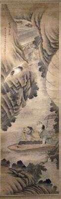 Of tall rectangular form, well painted with ink and color wash, depicting scholar and attendant on riverscape, rows of script and three red seal marks.