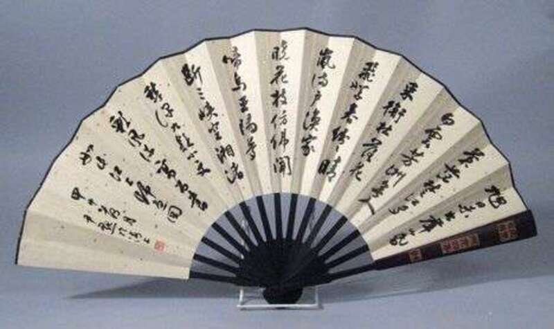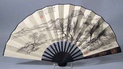 Seal mark Incised bamboo guards and plain sticks, ink on paper landscape with script and seal mark, rows of script and gold flakes to verso.