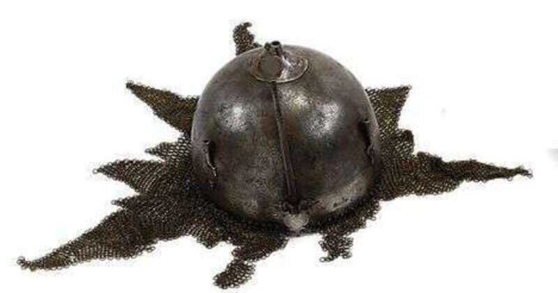 Of dome form, adjustable nose guard, plume mounts, missing finial, mail neck-guard of butter rings, worked in low relief to show typical landscape and figural scenes and script.