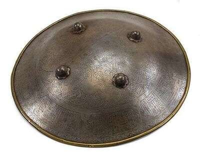 Of typical dome form, four button form protrusions, brass bound and worked in low relief to show detailed foliate and bird garlands and script, good signs of use.