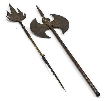 Comprising of a double ended weapon, steel engraved four pong spear head to one end joined by shagreen grip to a second barbed long spear head, together with a heavy steel engraved finial blade mounted double axe head.