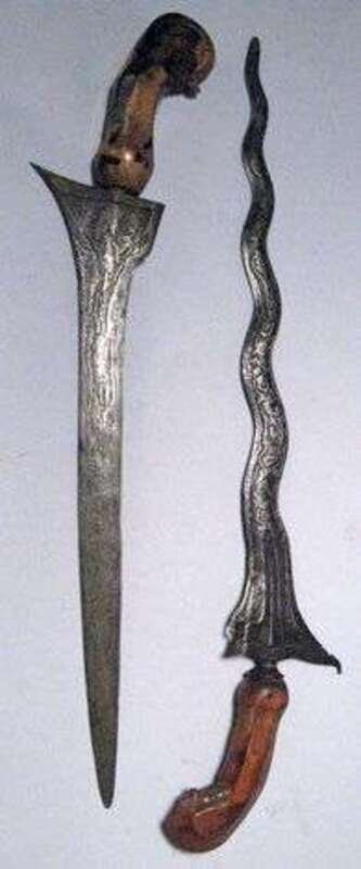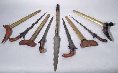 The Moro spear is of double undulating edge and silver ferrule, together with four good Kris all with shaped blade, wood winged throat and hilt and brass scabbards.