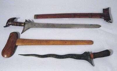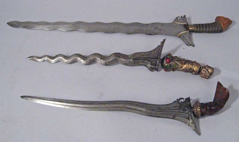 Comprising of a gilt metal and glass jeweled hilt kris, white metal wire bound grip, shaped steel and silver bound bladed and detailed carved scabbard kris, together with three other kris, all with wood scabbards.