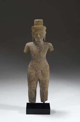 Rare and exceptional Khmer sandstone standing figure 12th century