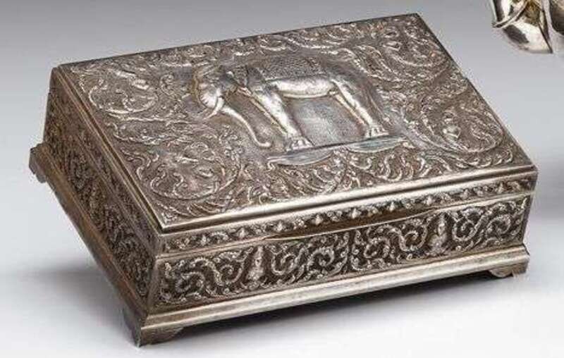 Of rectangular form, repousse hinged cover worked to show an elephant framed by scrolling leaves, the base worked to figures among scrolls, raised on bracket feet, burlwood lined interior.