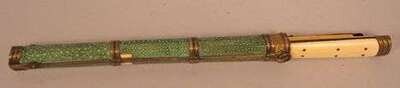 The shagreen case houses, two ivory chop-sticks, knife and blade.