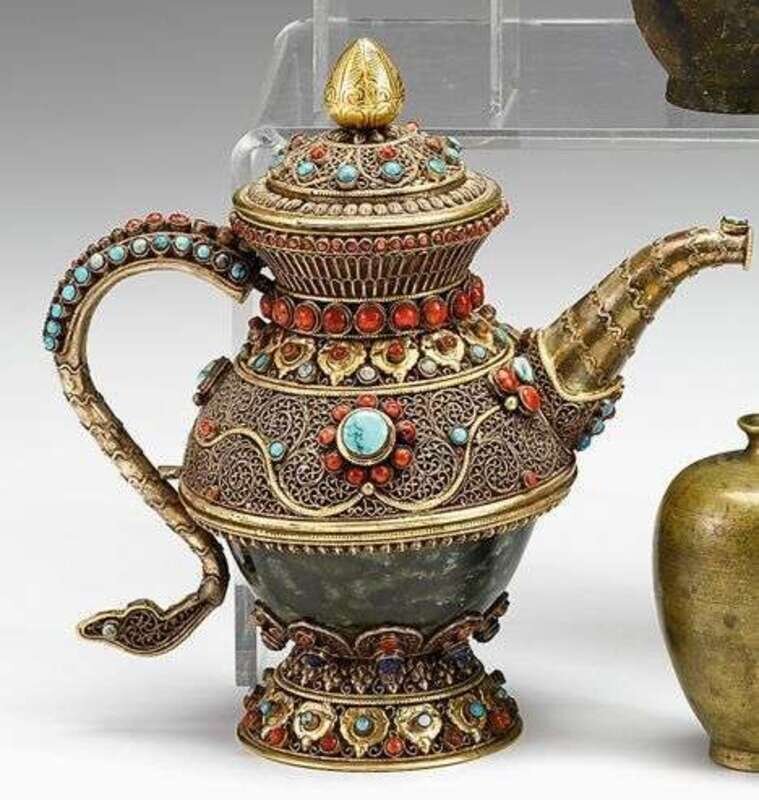 Tibetan silver, gilt silver, turquoise and coral jeweled jade mounted ewer early 20th century