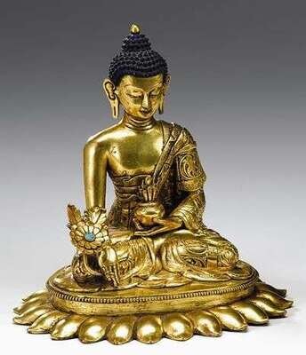 Finely cast and seated in dhyanasana, with left hand in dhyanamundra supporting a flaming bowl, while the left hand in bhumisparsamundra supports a turquoise mounted flower head, blue tone tightly curled hair and bud usnisha, scroll incised robe, open at chest, beaded base and flat petal lotus base, copper impressed base.