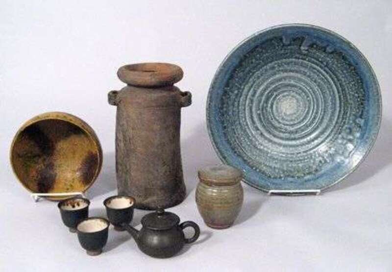Comprised of a glazed tea service of four pieces, grey-glazed kogo, green glazed stoneware chawan, seto-studio jar, and a large molded and blue glazed charger.