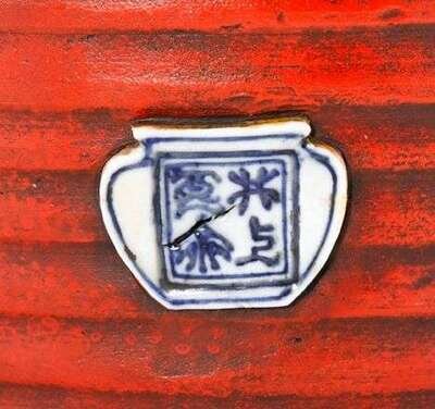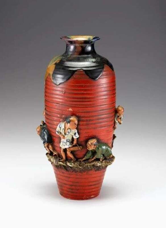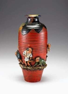 Flambe glaze to neck and shoulder, baluster form body, five high relief figures walking a ledge over a ribbed red vase body.