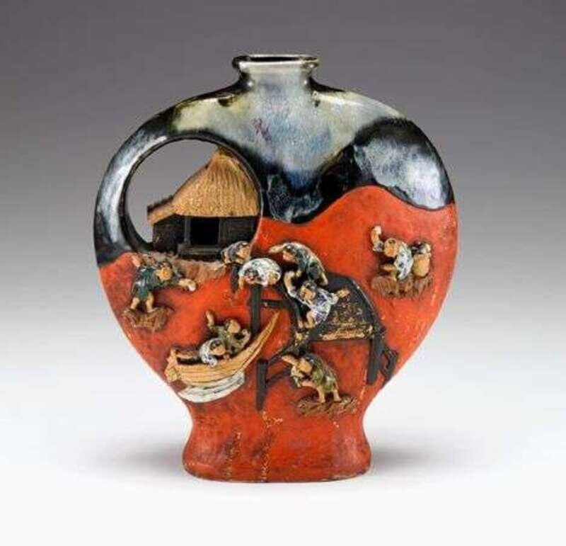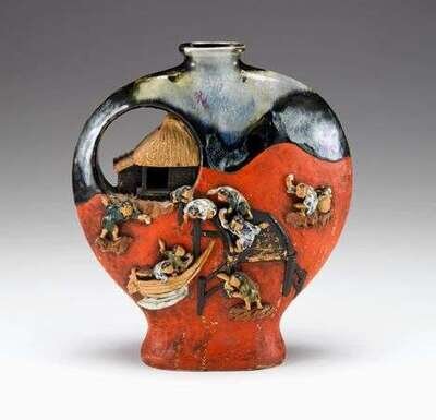 Of moon flask form, potted to show a open work hut forming and arched handle, several glazed high relief figures to the body, flambe glaze to the mouth and shoulder, red pigment to the body.