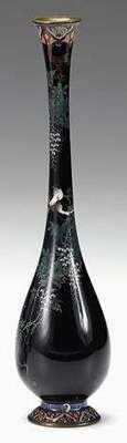 Of pear shape form, long slender issues from a ovoid body raised on a circular foot, arabic shield diaper to neck rim issuing a branch of wisteria supporting two song birds, in fine silver wire over a midnight blue ground, alternating shield diper to base, gilt metal mounts.