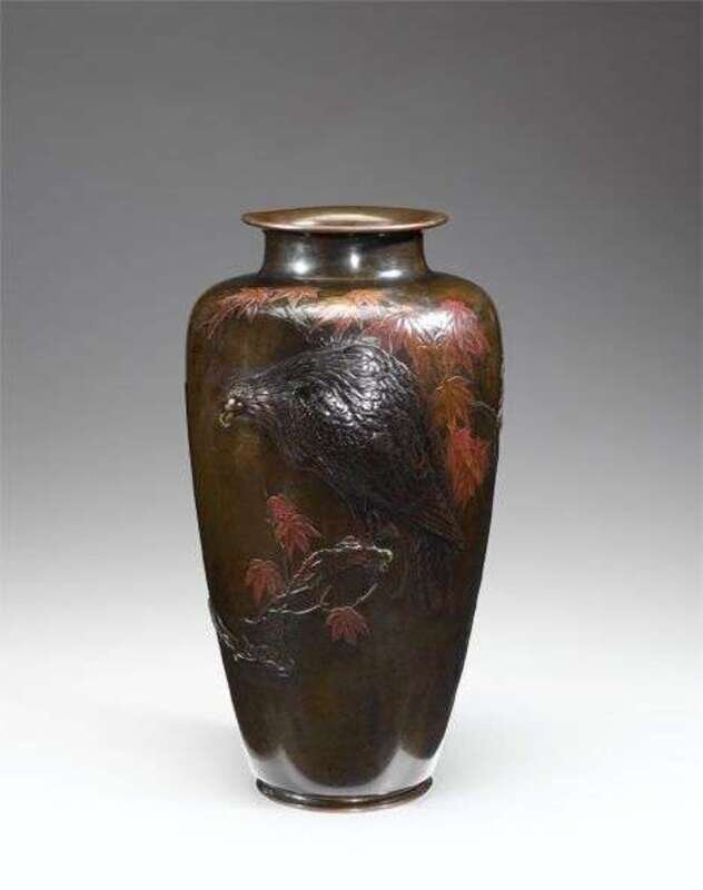 Of baluster form, flared mouth over a straight neck, worked to show a hawk over a maple tree, fine detailed cast body.
