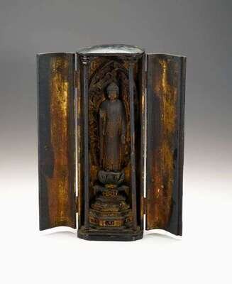 Carved to show softly draped robes, hands in an-i-in mantra, serene expression, urna and usnisa inlaid with crystals, lotus plinth pedestal and framed by open-work halo, cased, moderate losses.
